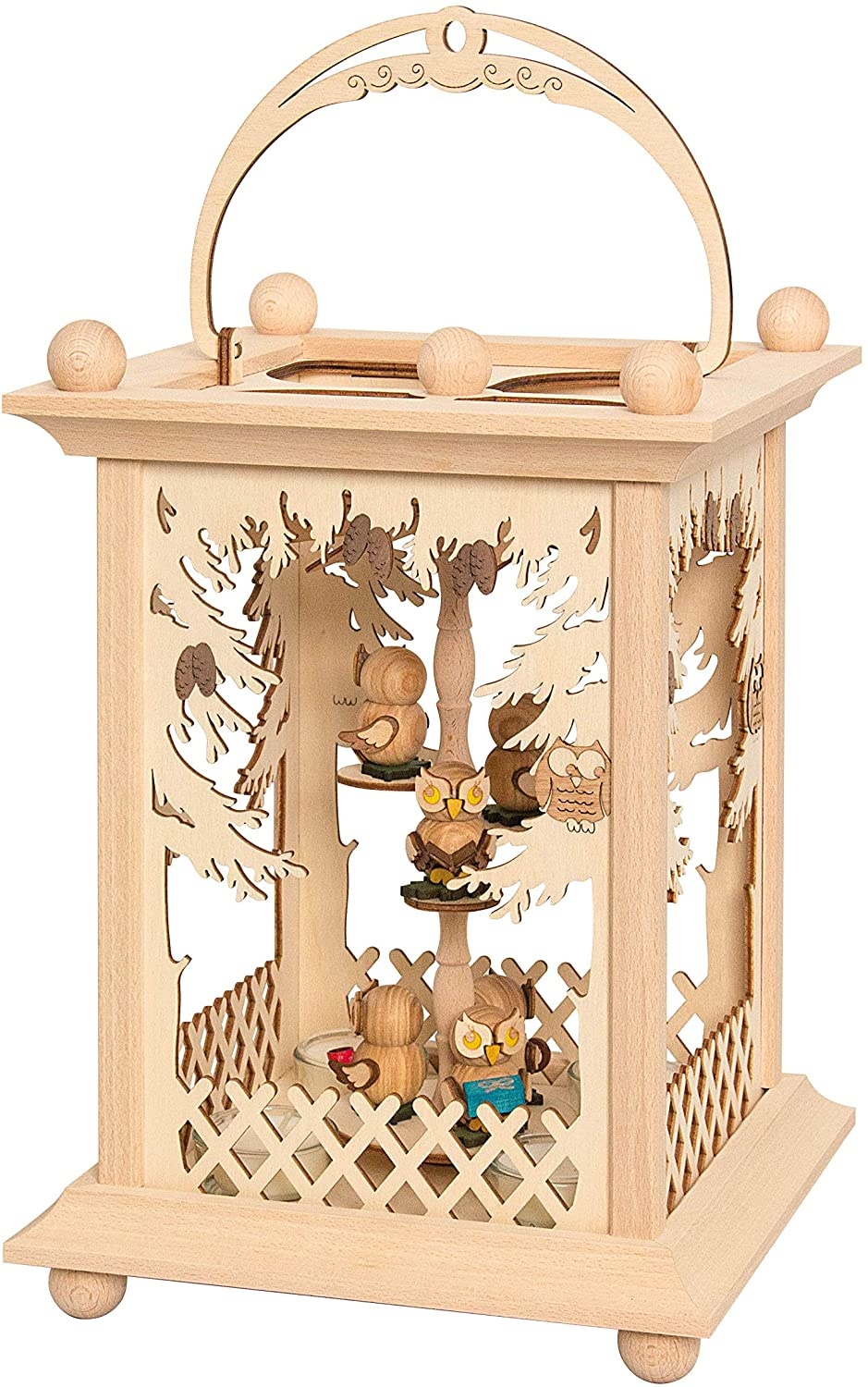 Die Laternenpyramiden vereinen den Charme einer Laterne und die Bewegung einer Pyramide in sich. In vier Ebenen drehen sich die kleinen Eulenkinder rund um die Mittelsäule, bewegt durch ein Flügelrad im Inneren der Laterne. Die aufwändig gestalteten Laternenmotive sind zusätzlich mit Applikationen aus Edelholzfurnier dekoriert.